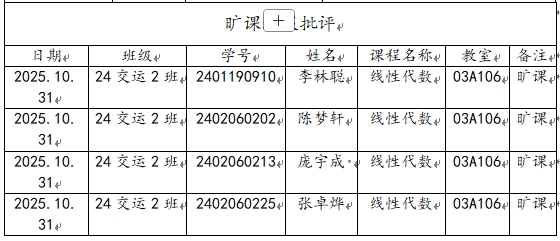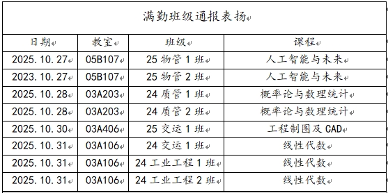 为营造良好学风,教育引导学生端正学习态度,遵守课堂纪律,规范课堂秩序。现将我院2025年秋季学期第9周课堂考勤情况予以通报,详情如下:
