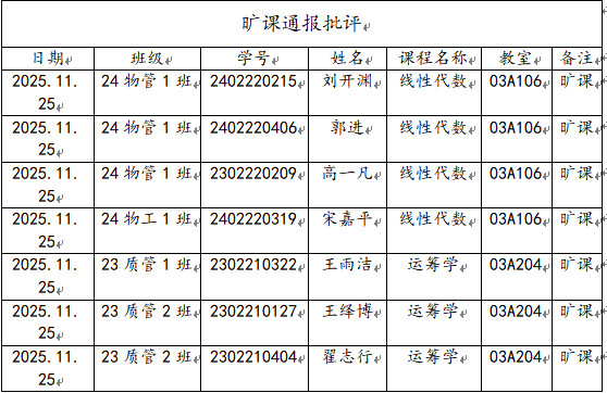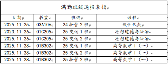 为营造良好学风,教育引导学生端正学习态度,遵守课堂纪律,规范课堂秩序。现将我院2025年秋季学期第十三周课堂考勤情况予以通报,详情如下: