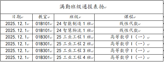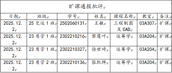 为营造良好学风,教育引导学生端正学习态度,遵守课堂纪律,规范课堂秩序。现将我院2025年秋季学期第14周课堂考勤情况予以通报,详情如下: