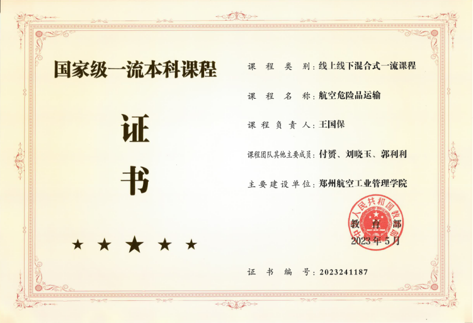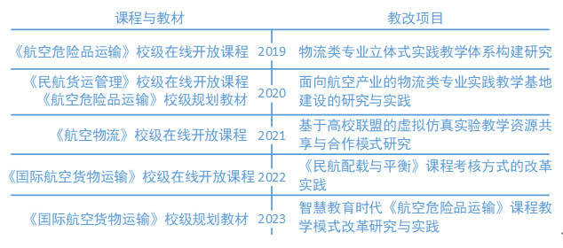 向下扎根,向上生长。课程组在持续培养高素质航空物流人才的同时,也开始收获教学改革的成果。从2019年-2023年,课程组先后获批4门校级在线开放课程,2部校级规划教材,5项校级教改项目。《航空危险品运输》作为课程组重点建设课程,于2021年5月获批河南省一流本科课程,2023年5月获批国家一流本科课程。