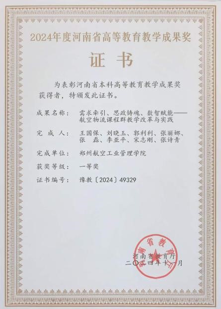 勇毅创新,彰显新范。课程组直面智慧民航发展新趋势,以AI、大数据等现代技术为利剑,以虚拟仿真与数智平台为阵地,打造出“技术赋能、虚实融合”的教学新场景。2021年,“思政引领、数智赋能航空物流课程体系教改探索与实践”河南省高等教育教学改革研究与实践项目立项,2024年,“需求牵引、思政铸魂、数智赋能——航空物流课程群教学改革与实践”获得河南省高等教育教学成果一等奖。