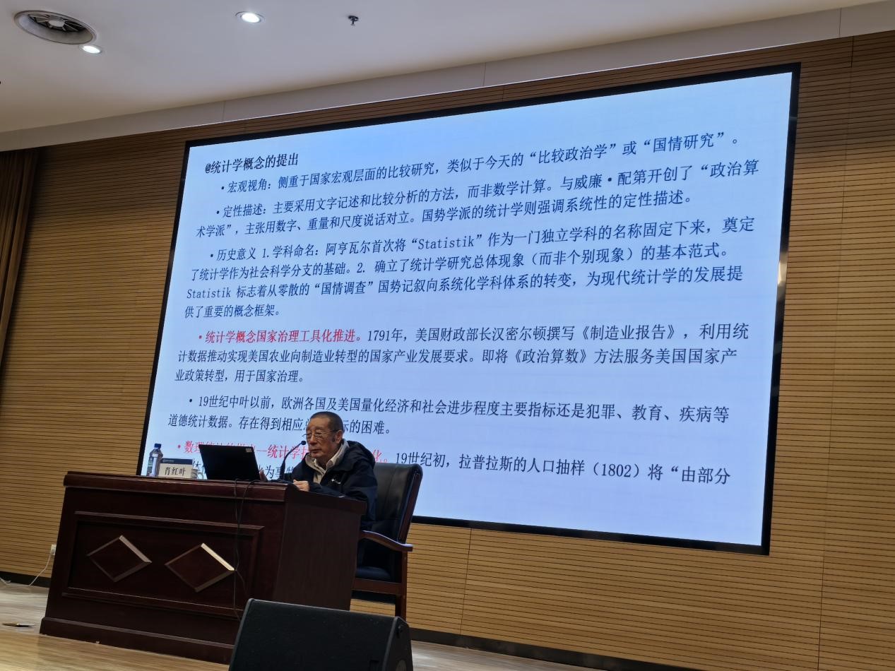 肖红叶教授围绕主题,从四个方面进行了深入浅出的阐述:一是学科属性选择与应对理性;二是数据科学体系构建问题;三是统计学的人工智能转型问题;四是“超越”通用教学智能体的开发情况。肖教授的讲解高屋建瓴,见解深刻,既有对学科本质的深邃思考,也有对未来发展方向的敏锐洞察,为在场师生带来了深刻的启发,赢得了阵阵掌声。