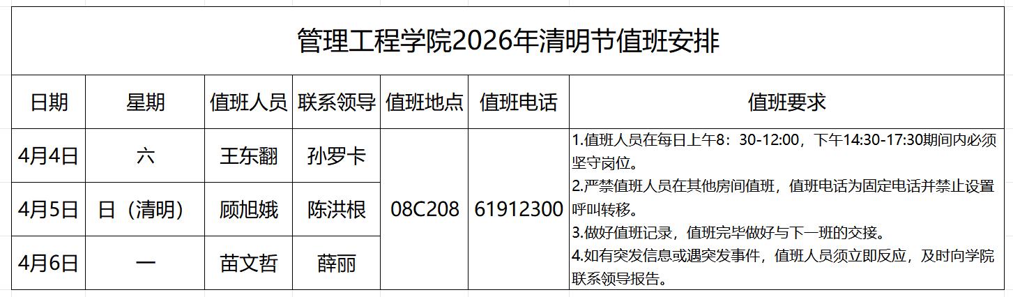 管理工程学院2026年清明节值班安排