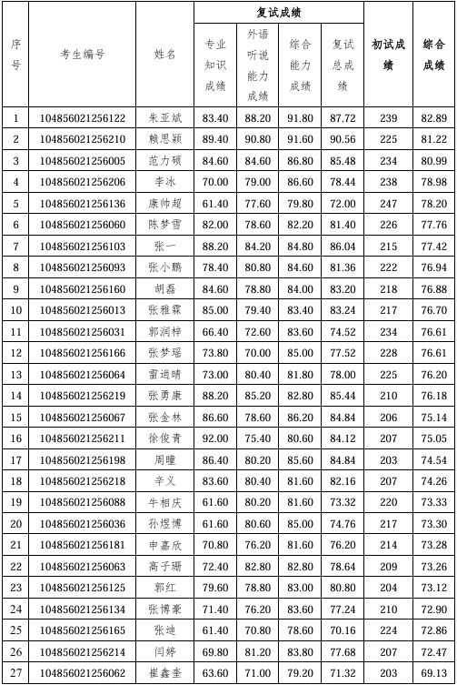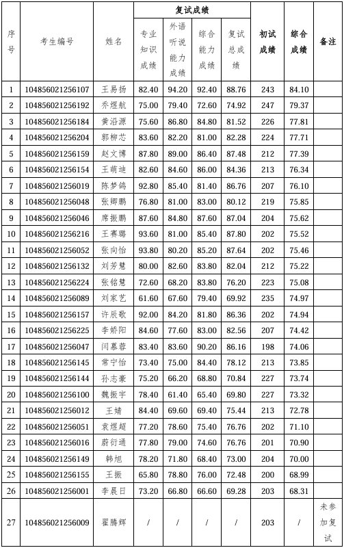根据学院2026年研究生招生复试工作安排,一志愿考生复试成绩公示如下: