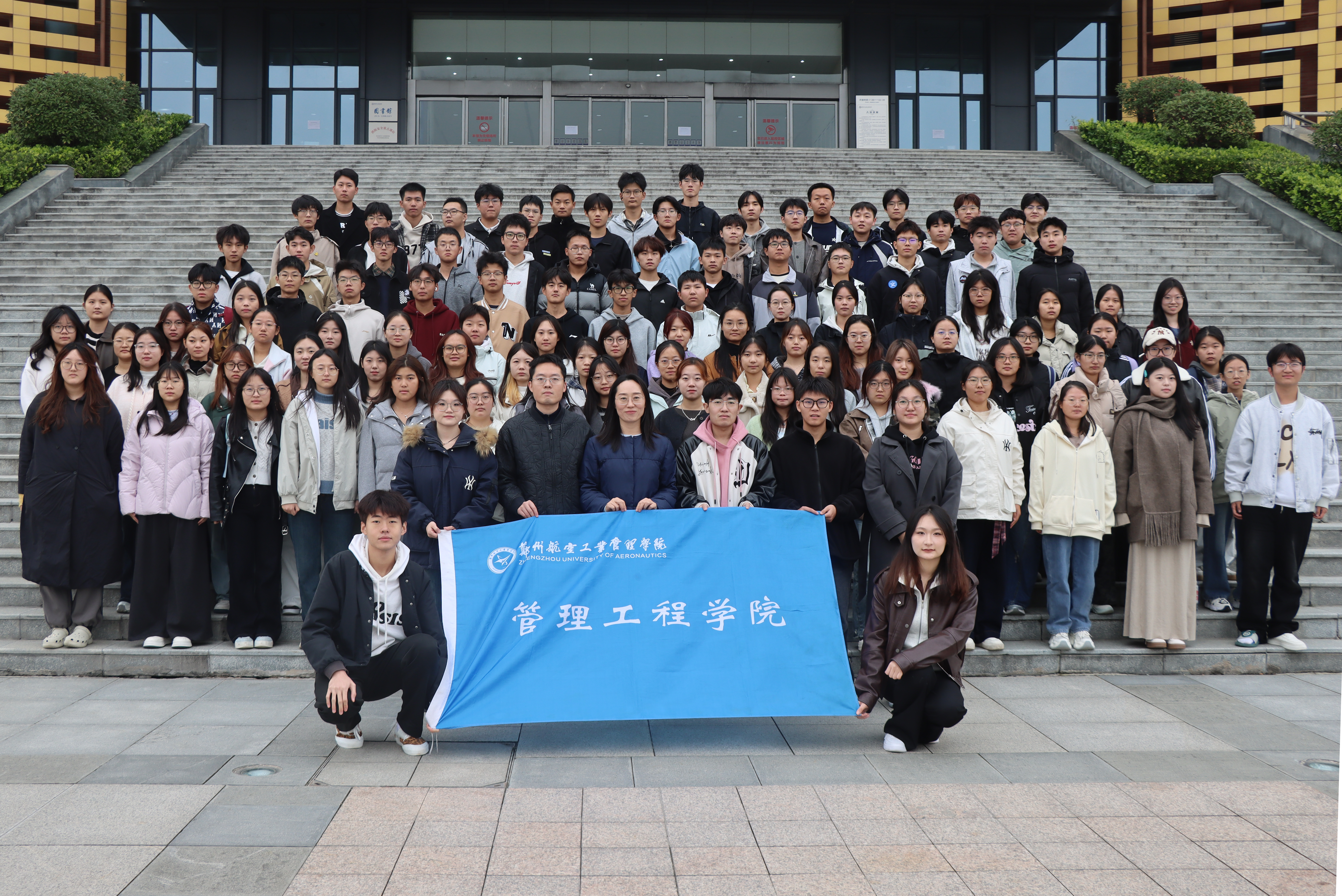 大会最后,全体参会人员在图书馆前拍摄集体合影,为本次大会画上圆满句号。相机定格下了这张充满朝气与希望的全家福,它不仅记录下了新学期管工团委学生会的崭新面貌,也象征着全体成员携手并进、共创未来的决心。